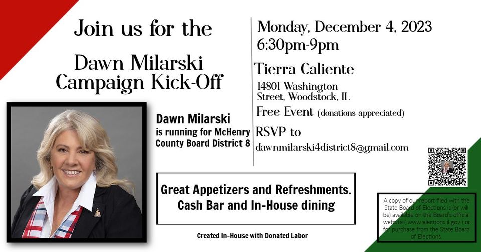 County Board District 8 Candidate Dawn Milarski will be kicking off her campaign and celebrating everyone’s hard work getting candidates on the ballot at an event on December 4th in Woodstock.