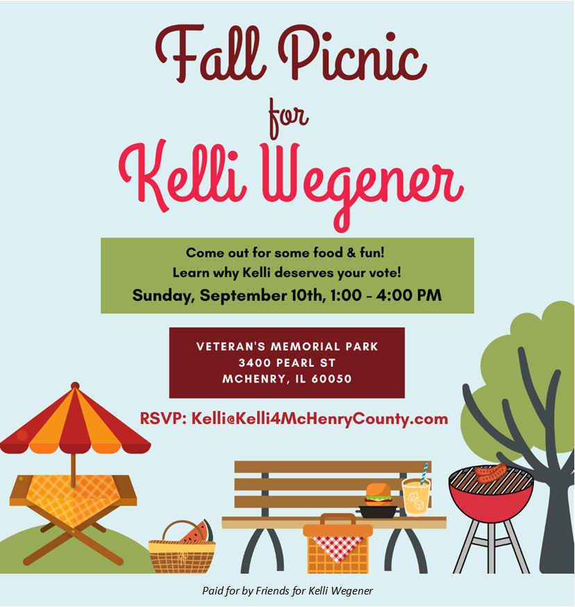 The stupendous Kelli Wegener, currently on the McHenry County Board for District Five, is running for chair of the county board — a tremendously important office, for which she is well-qualified. It’s very important that we elect her.