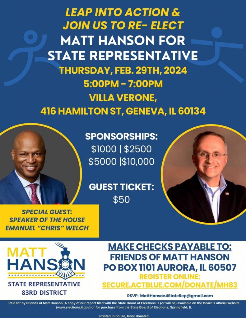 Leap into action and join us to re-elect Matt Hanson as State Representative in the 83rd district (western suburbs.) With special guest Emanuel “Chris” Welch, Speaker of the House.