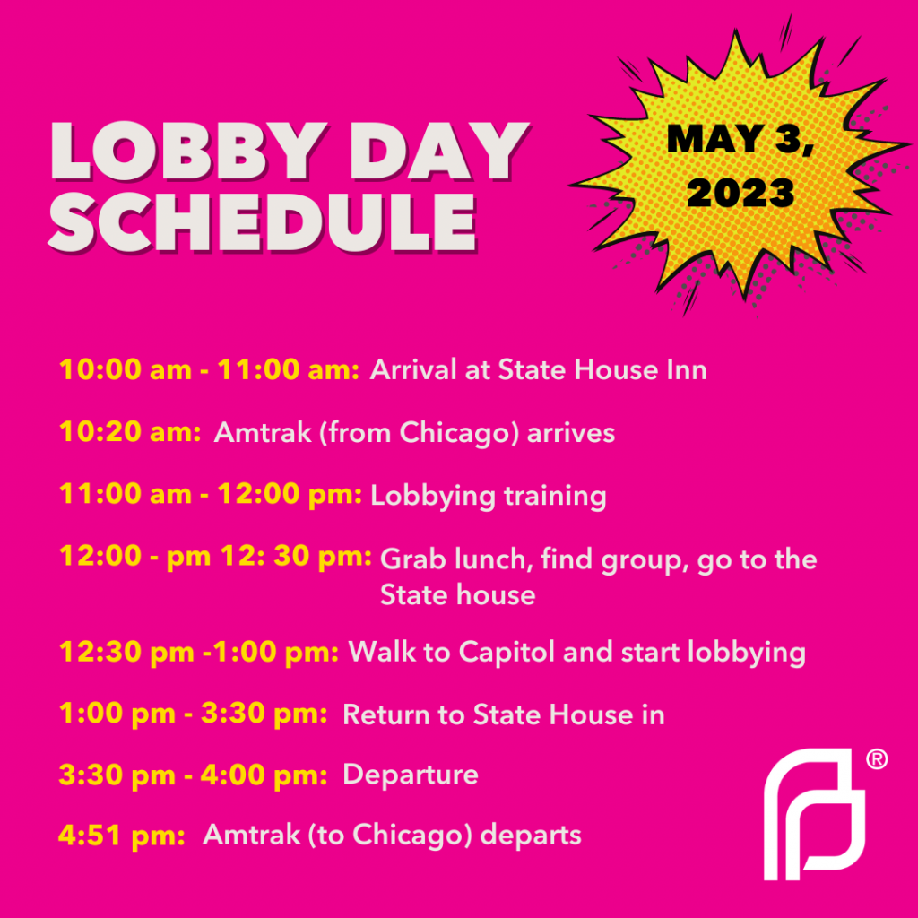 Personal PAC will be coordinating transportation between Chicago and Springfield and Planned Parenthood Illinois Action will be providing training, lunch, T-SHIRTS, and everything you will need for a successful day.
