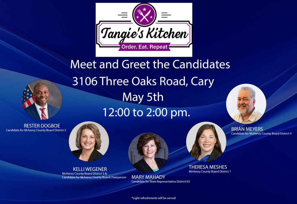 Soul food can be very hard to find in McHenry County, so you won’t want to miss our Candidates Meet n Greet at Tangie’s Kitchen at noon on Sunday May 5th.