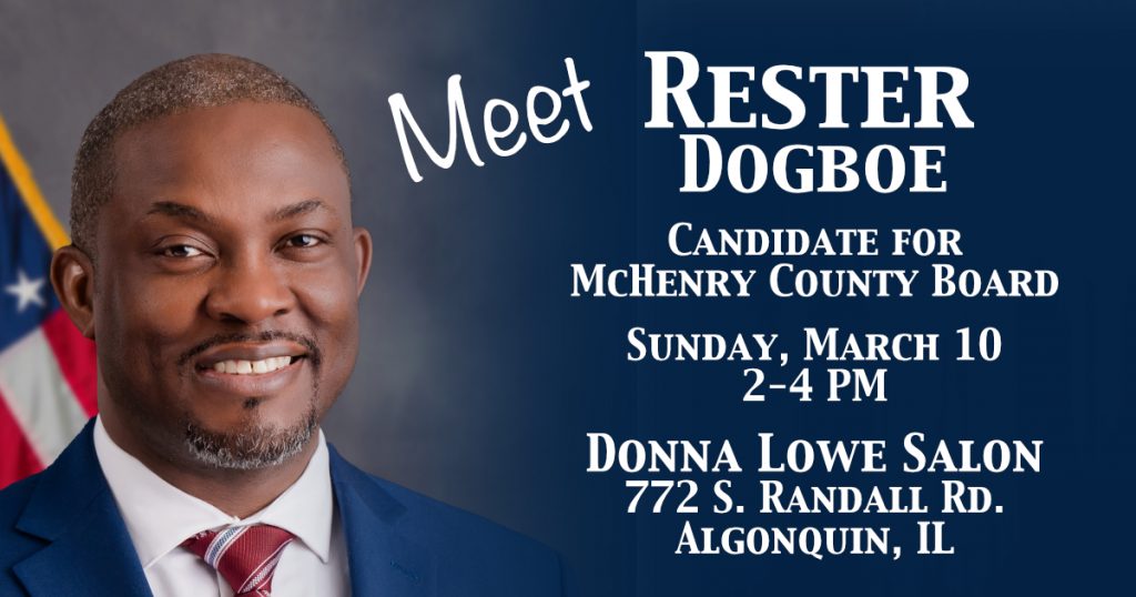 Rester Dogboe writes:  “Originally from Ghana, I came to the US ten years ago with my wife and young son – after patiently waiting our turn in the annual immigration lottery for four years.  We became naturalized US citizens as soon as we could, welcomed two more children, and are grateful that we could create better lives for our family in McHenry County. I’m a professional IT auditor, and I know we can improve systems and cut costs using technology.  I am dedicated to giving back to our community!”