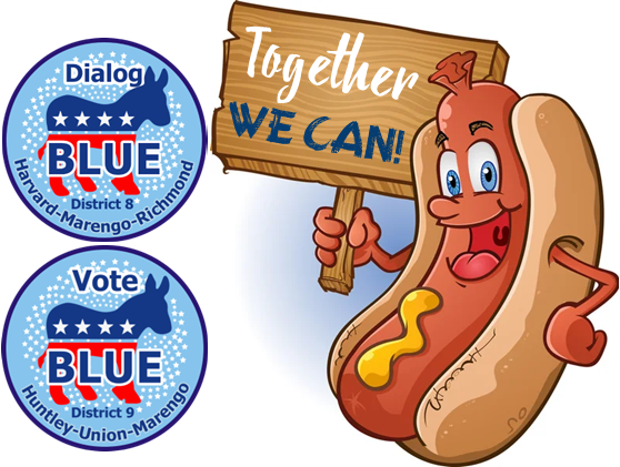 It’s the annual McHenry Dems picnic for county board districts 8 and 9, including Huntley, Marengo, Union, Harvard, Richmond and Hebron. We’ll be in picnic shelter two, the first one you come to. It’s a hot dog extravaganza, we’ll have plenty of delicious all-beef hot dogs, and vegetarian ones also, and plenty of fixings to make a true “Chicago dog”.