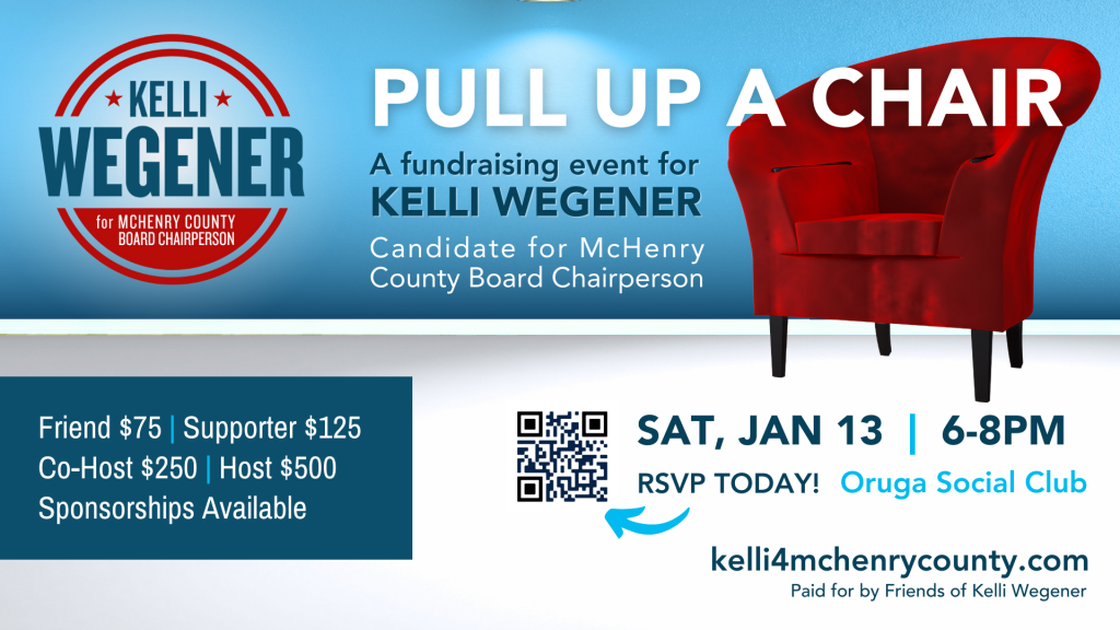 Kellli Wegener, currently on the McHenry County Board in District 5 and now running county-wide for chair of the board, writes: “I am holding a major fundraiser called “Pull Up a Chair” on Saturday, January 13th, from 6:00 – 8:00 pm, and I’m hoping you will attend. This is my first big fundraiser, and I want to show the Democratic Party of Illinois that I have a lot of support.”